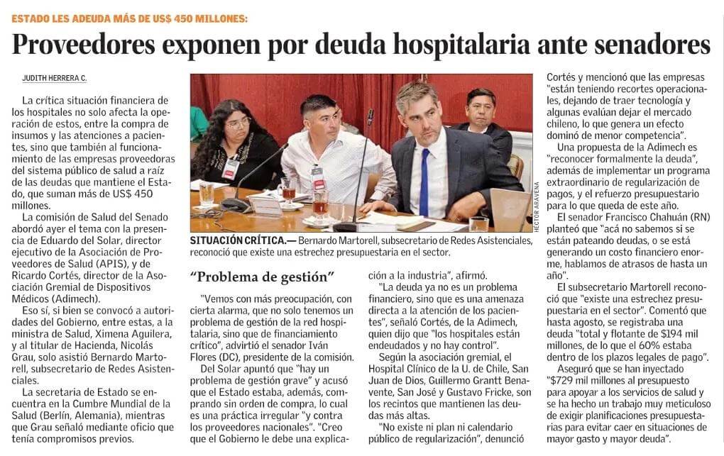 La comisión de Salud del Senado abordó ayer el tema con la presencia de Eduardo del Solar, director ejecutivo de la Asociación de Proveedores de Salud (APIS), y de Ricardo Cortés, director de la Asociación Gremial de Dispositivos Médicos (Adimech).